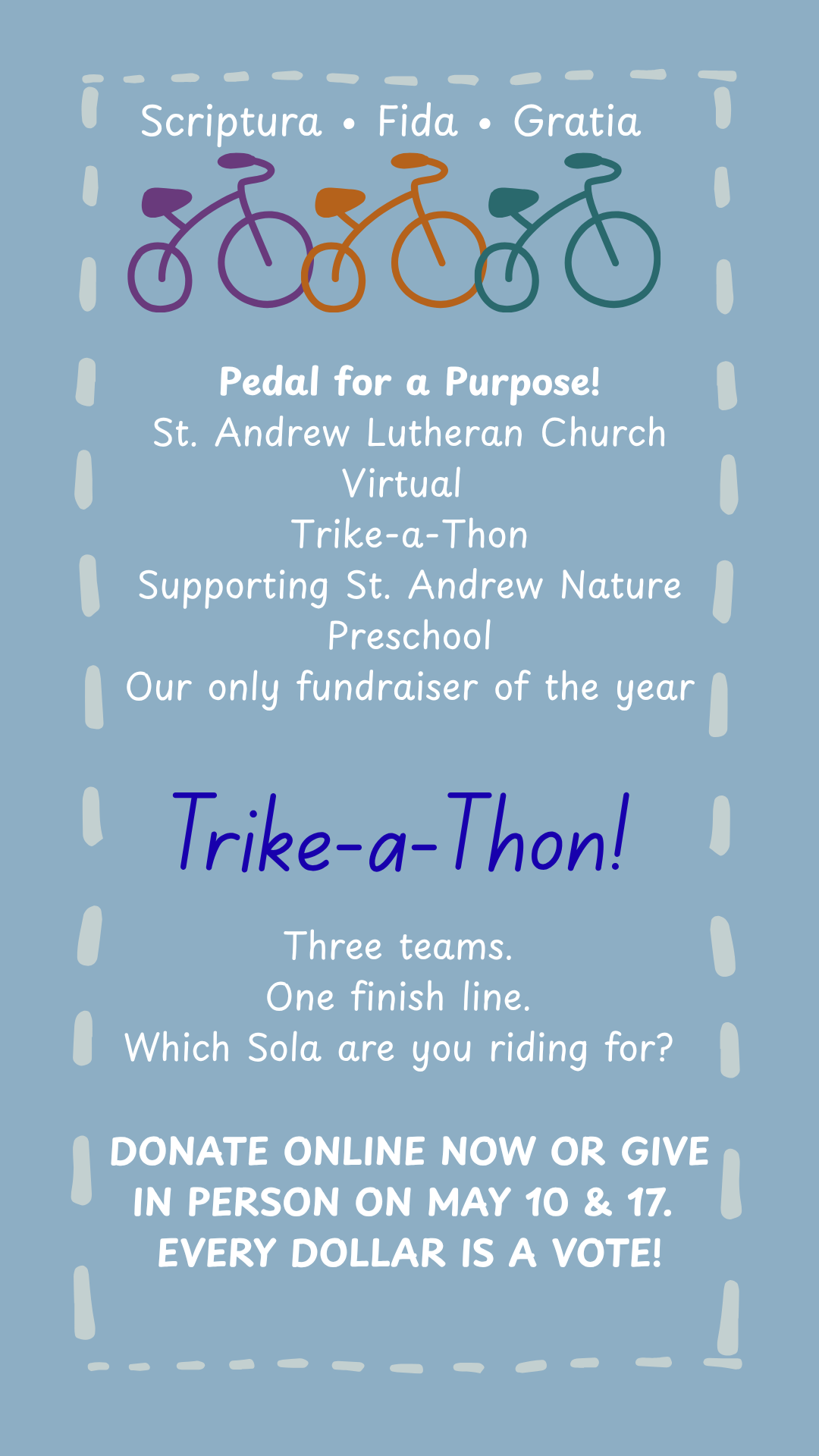 Every spring, St. Andrew's congregation runs its own Trike-a-Thon alongside the preschoolers — same spirit, different wheels. In 2024, we raced famous Lutherans: Martin, Katie, Sir Toby, and Johann Sebastian Bach. In 2025, we cheered on the Lutheran Legacy teams — music, theology, education, mission, and service. This year we're going deeper: Luther's Three Solas. The theological bedrock of the Reformation. Not familiar with the Three Solas? Scroll down for the full story — who Luther was, what he discovered, and why these three convictions still matter today.